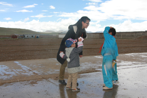 2007年8月援教期滿后,白覺措回到拉薩,在當雄縣納木湖鄉(xiāng)中心小學(xué)任教。四千八百米的納木湖鄉(xiāng)中心小學(xué)是拉薩市海拔最高的學(xué)校。每到冬天,這里都會迎來大風雪。而在大雪封山時,蔬菜是運不進來的。所以,白覺措和其他老師還要利用休息的時間帶領(lǐng)學(xué)生們在學(xué)校的高寒溫棚內(nèi)自己種菜,以備不時之需。白覺措淡淡得說道:“這里的夏天是很美,冬天卻讓人受不了。而且夏天并不是天天都是風和日麗,時不時還會來場冰暴。”正說話間,豆大的冰雹就下起來,“噼哩叭啦”打在窗戶上。白覺措急忙起身向外走去,因為正值午飯時間,學(xué)生們正朝食堂走向。天冷地滑,怕學(xué)生摔倒白覺措拉著自己兩歲半的兒子,站在空地上,對著遠處跑來的學(xué)生不停地喊道:“慢點,慢點,小心摔倒!……”。