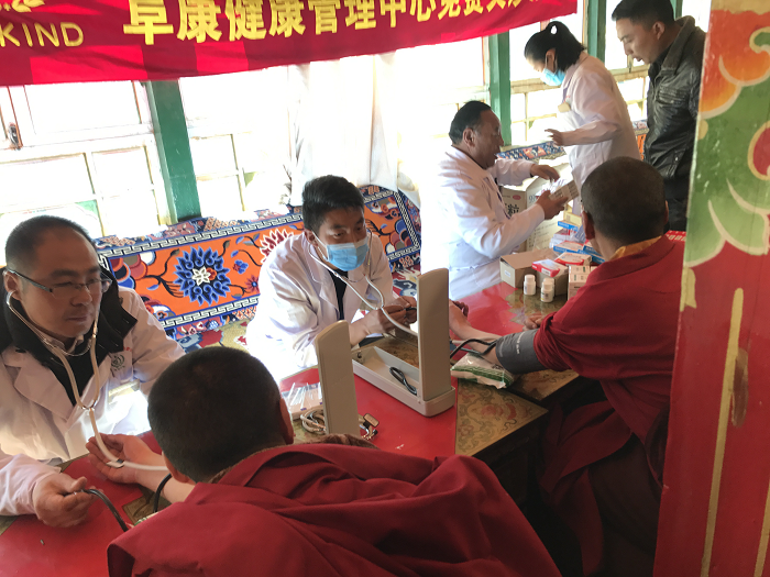 隨后,義診活動(dòng)井然有序地開始了,張?jiān)洪L(zhǎng)和田豐輝醫(yī)生負(fù)責(zé)測(cè)血壓,護(hù)士唐宗青測(cè)血糖,瓊瑪負(fù)責(zé)發(fā)放藥品,占堆(我院體檢中心醫(yī)務(wù)人員)對(duì)每一位血壓、血糖高的僧人、群眾進(jìn)行登記,有利于以后對(duì)他們的健康進(jìn)行隨訪跟蹤,了解他們有無(wú)不適以及血壓、血糖情況,督促他們的按時(shí)服藥、并指導(dǎo)他們健康的生活方式。在義診體檢過(guò)程中,一名76歲的老人,血壓200/120mmHg,經(jīng)過(guò)詢問(wèn),老人身體并沒有不適,在詳細(xì)的給老人講解了高血壓對(duì)身體健康的影響,以及高血壓帶來(lái)的危害后,并給予老人免費(fèi)發(fā)了治療高血壓的藥物,囑咐他這幾天要每天規(guī)律服用降壓藥物、監(jiān)測(cè)血壓,直至血壓在正常范圍后可以改為三到五天測(cè)一次血壓,但降血壓藥物不能停止,老人欣然接受意見,并握手致謝。