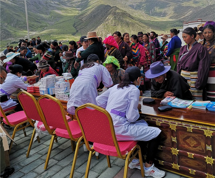當天上午,全國婦聯(lián)宣傳部、自治區(qū)婦聯(lián)、拉薩市婦聯(lián)、那曲市婦聯(lián)一行來到安置點為群眾贈送了藏漢雙語書籍。阜康義診工作隊也來到現(xiàn)場為安置點居民量血壓、檢查病情并詢問身體情況,耐心細致地為群眾分析病情、講解日常衛(wèi)生保健、合理用藥等衛(wèi)生常識,認真解答關(guān)于常見病、多發(fā)病的預(yù)防診治及愈后注意事項。僅一個上午時間就為100余名安置點群眾開展了問診、聽診、答疑、測血壓和健康知識宣傳,免費發(fā)放各類藥品價值4萬余元 。