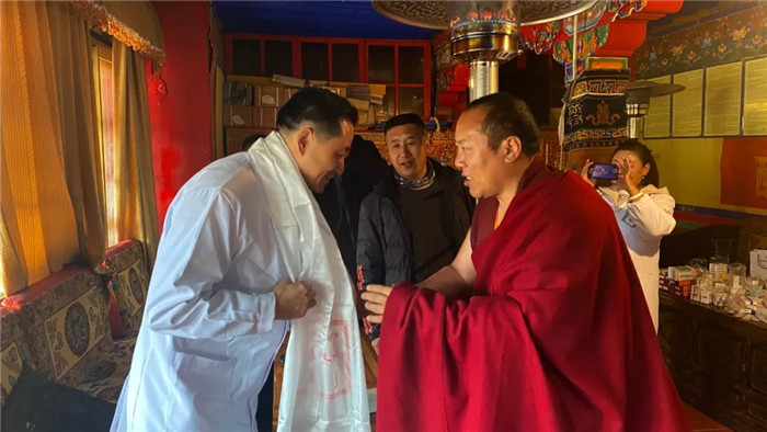 義診結(jié)束后,甘丹寺經(jīng)師阿旺曲帕為義診組每位成員獻(xiàn)上哈達(dá),以表達(dá)對阜康醫(yī)院的感激之情。