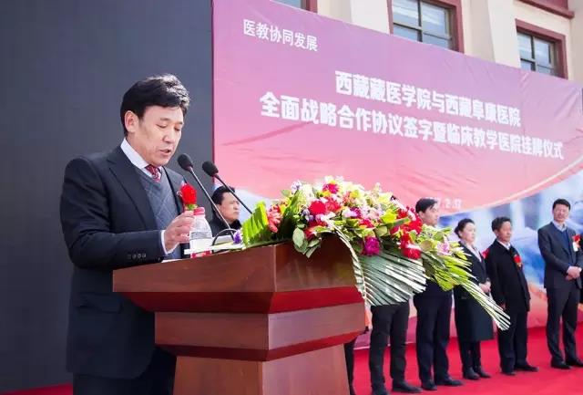 隨后,王斌董事長(zhǎng)在儀式中發(fā)表講話,全面介紹了西藏藏醫(yī)學(xué)院及西藏阜康醫(yī)院的發(fā)展歷程,并表示西藏藏醫(yī)學(xué)院和西藏阜康醫(yī)院達(dá)成全面戰(zhàn)略合作,旨在進(jìn)一步加強(qiáng)雙方戰(zhàn)略合作關(guān)系,雙方將在良好的合作和互信基礎(chǔ)上,本著“優(yōu)勢(shì)互補(bǔ)、資源共享、互惠互利、合作共贏”的原則,重點(diǎn)在人才培養(yǎng)、科學(xué)研究、學(xué)科建設(shè)、醫(yī)療服務(wù)等方面開(kāi)展長(zhǎng)期合作,提升雙方在醫(yī)療、科研、人才培養(yǎng)及社會(huì)服務(wù)等方面的綜合水平;王斌董事長(zhǎng)還表示,為培養(yǎng)應(yīng)用型醫(yī)學(xué)人才,西藏阜康醫(yī)院特在西藏藏醫(yī)學(xué)院設(shè)立了30萬(wàn)元助學(xué)、助教基金,用于幫助學(xué)習(xí)優(yōu)秀卻又家境貧寒的莘莘學(xué)子和鼓勵(lì)辛勤耕耘的優(yōu)秀教師。