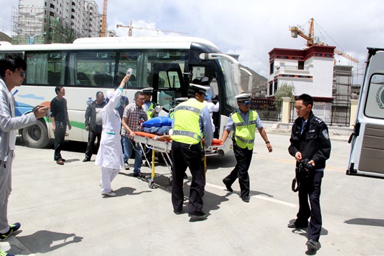 “我公司旅游車藏AL0887去機場途中,在柳梧村附近發(fā)生側翻,有乘客受傷,請求支援。”隨著模擬報警電話響起,此次應急演練正式開始。旅游公司、110、120分別接到報警電話后,迅速趕往“事故現(xiàn)場”進行救援,同時,西藏旅游汽車公司也立即啟動應急預案。