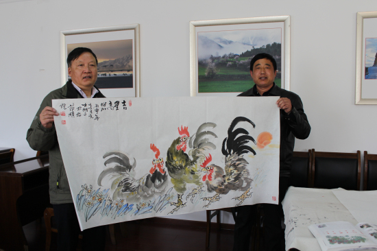 交流會上陳明文先生展示了自己的近期作品,韓書力主席贊其作品妙筆丹青、活靈活現(xiàn)、入木三分。沈開運主席代表自治區(qū)文聯(lián)收錄了陳明文畫作《吉星高照》并贊其筆下公雞活靈活現(xiàn)、出神入化。