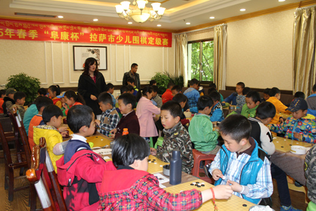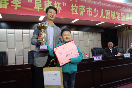 3月25日比賽結(jié)束后“復(fù)康杯”少兒圍棋定級(jí)賽頒獎(jiǎng)儀式開始,拉薩棋院院長王斌、西藏阜康醫(yī)藥發(fā)展有限公司總經(jīng)理劉瀟瀟、西藏阜康醫(yī)藥發(fā)展有限公司總經(jīng)理陳彬、拉薩棋院圍棋部副主任趙鈞以及棋院老師陳學(xué)滸、袁文琴出席了本次會(huì)議。 王斌院長在頒獎(jiǎng)儀式表示,很高興能夠舉辦拉薩市首屆“阜康杯”少兒圍棋定級(jí)賽,他向比賽獲勝者表示衷心的祝賀,希望他們能再接再厲繼續(xù)學(xué)習(xí)圍棋。他了解到很多家長對(duì)拉薩市棋院選址郵政賓館非常滿意,這里環(huán)境清幽,非常適合教學(xué),他當(dāng)場表示郵政賓館二樓已經(jīng)被棋院斥資180萬元租賃6年,至少在6年以內(nèi)棋院不會(huì)從新選址。王斌表示,目前,拉薩棋院正在向上級(jí)有關(guān)部門申請(qǐng)圍棋段位資格證的相關(guān)事宜,如無意外,預(yù)計(jì)在今年年底能夠申請(qǐng)成功,完成圍棋段位資格證的申請(qǐng),不僅能給我區(qū)圍棋事業(yè)的發(fā)展帶來很大的幫助同時(shí)也能讓我區(qū)更多的圍棋愛好者參與到此次項(xiàng)目。