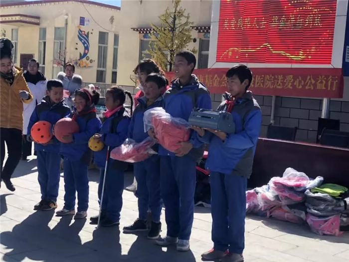 11月1日上午,西藏阜康天使基金會(huì)吉拉女士受西藏阜康醫(yī)療股份有限公司黨委書(shū)記、阜康天使基金會(huì)會(huì)長(zhǎng)王斌先生,西藏阜康醫(yī)療股份有限公司總經(jīng)理、阜康天使基金會(huì)秘書(shū)長(zhǎng)劉瀟瀟女士委托與西藏阜康醫(yī)院義診隊(duì)一起,攜價(jià)值一萬(wàn)五千元的藥品和兩萬(wàn)元的物資來(lái)到那曲市特殊教育學(xué)校,為這里的孩子們帶來(lái)了文化體育學(xué)習(xí)用品及藥品等物資。在特校校長(zhǎng)次仁拉姆的組織下,特校師生列隊(duì)歡迎我們的到來(lái),還精心準(zhǔn)備了錦旗和潔白的哈達(dá)。