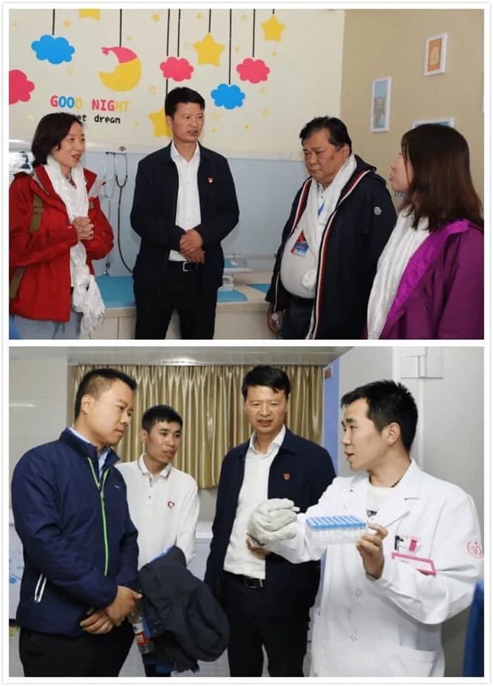 義診期間,中共中央統(tǒng)戰(zhàn)部七局處長郭鵬與“同心共鑄中國心”駐西藏秘書長趙士磊來到了阜康婦產(chǎn)兒童醫(yī)院詳細(xì)查看了正在井然有序進(jìn)行的義診現(xiàn)場(chǎng),在王斌董事長陪同下參觀阜康婦產(chǎn)兒童醫(yī)院院區(qū),聽取并查看了我院人類輔助生殖醫(yī)學(xué)中心等特色科室的開展情況。
