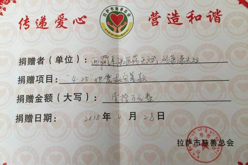 在西藏,哪家有災(zāi)哪家有難,在王斌董事長知情的情況下,都會伸出援助之手,這次尼泊爾地震,除了醫(yī)院募捐的現(xiàn)金205682元外,王總私人還拿出了十萬元捐贈給災(zāi)區(qū),希望自己的綿薄之力能助災(zāi)區(qū)人民早日走出陰霾。