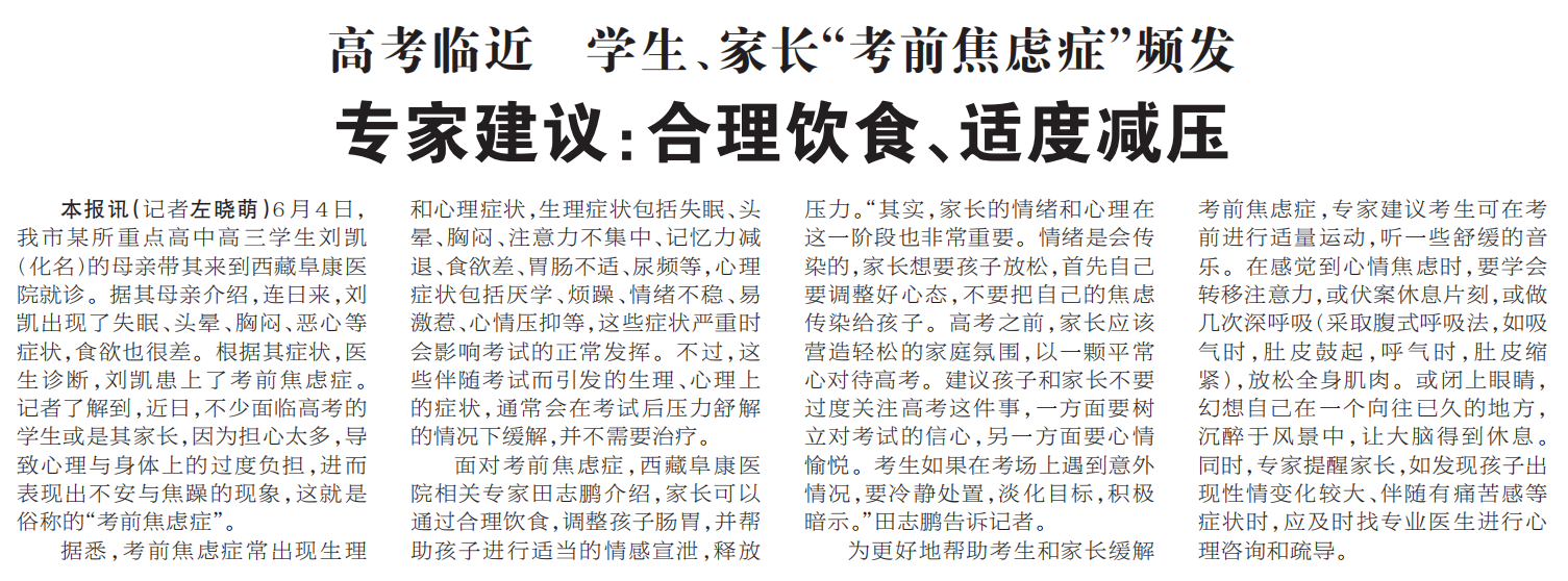 面對考前焦慮癥,西藏阜康醫(yī)院相關(guān)專家田志鵬介紹,家長可以通過合理飲食,調(diào)整孩子腸胃,并幫助孩子進行適當?shù)那楦行?,釋放壓力?ldquo;其實,家長的情緒和心理在這一階段也非常重要。情緒是會傳染的,家長想要孩子放松,首先自己要調(diào)整好心態(tài),不要把自己的焦慮傳染給孩子。高考之前,家長應(yīng)該營造輕松的家庭氛圍,以一顆平常心對待高考。建議孩子和家長不要過度關(guān)注高考這件事,一方面要樹立對考試的信心,另一方面要心情愉悅??忌绻诳紙錾嫌龅揭馔馇闆r,要冷靜處置,淡化目標,積極暗示。”田志鵬告訴記者。