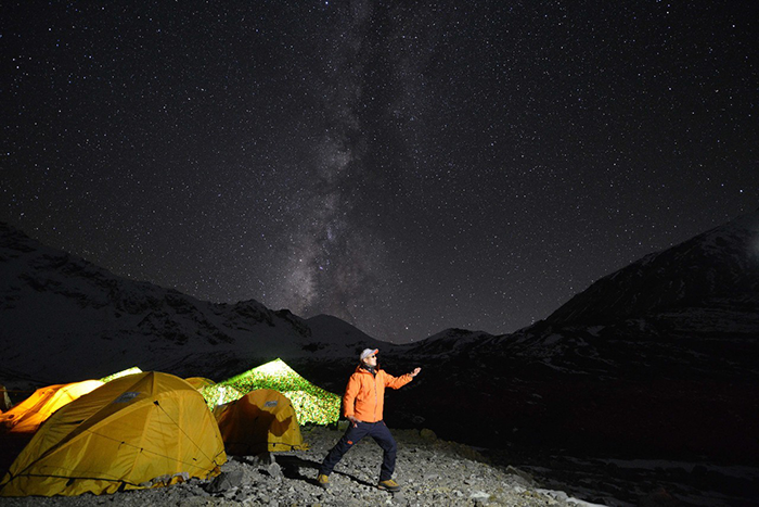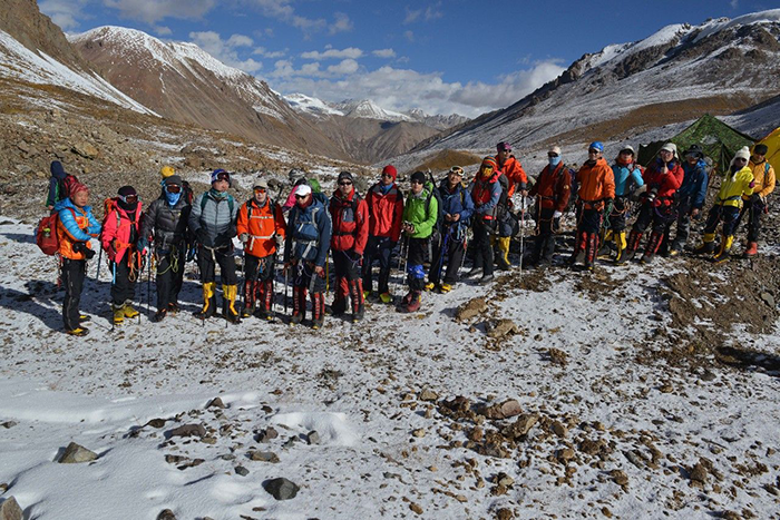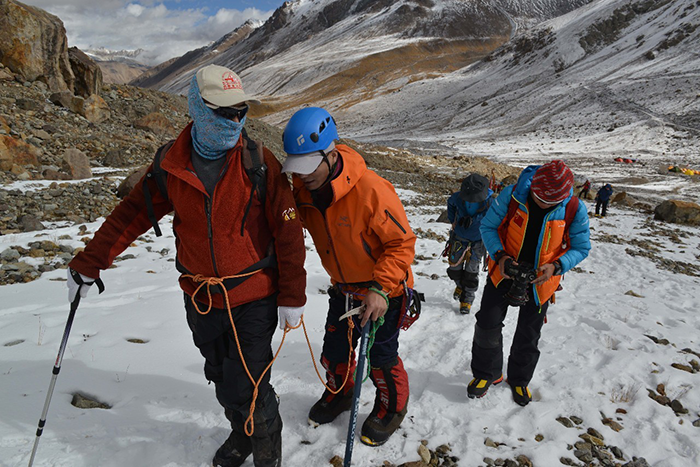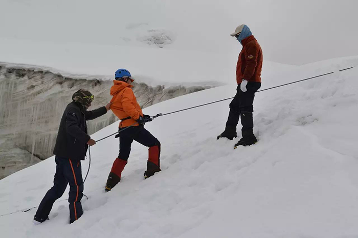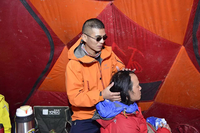 在海拔5500米處的雪線位置,教練們,選擇了一處較為平緩的雪坡,作為大本營,在這里對隊員們進行登頂前的指導訓練。指導隊員們使用上升器與下降器,體驗穿著高山靴帶著冰爪走路的感覺,教練們在這里認真介紹技術(shù)要領,并耐心解答隊員們提出的各種問題。休息之余大家都躲在帳篷里,有說有笑,完全消除了屋外雪山的寒冷。有從內(nèi)地來的隊友,因高原反應,頭疼難忍,張洪就幫他們一一按摩推拿,緩解疼痛,大家就像一家人,其樂融融。