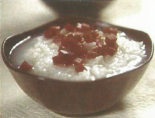 【做法】生地黃(鮮品洗凈細(xì)切后,用適量清水在火上煮沸約30分鐘后,潷出藥汁,再復(fù)箭煮一次,兩次藥液合并后濃縮至100ml,備用。將大米洗凈煮成白粥,趁熱加入生地汁,攪勻食用時加入適量白糖調(diào)味即可。