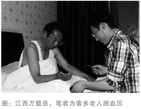 我們5月15日從拉薩出發(fā),一路向東,到成都轉(zhuǎn)機(jī),兩天的時(shí)間,已經(jīng)跨越了2400多公里。16日,載著夢(mèng)想的飛機(jī)抵達(dá)了江西南昌機(jī)場(chǎng),劉春生老人的大兒子在機(jī)場(chǎng)熱情地迎接我們,將我們接到老人的故鄉(xiāng)萬載縣。我們決定在縣城賓館休息一天后再啟程前往劉春生老人的家,于是我為同行的兩位老人做了全面的檢查,索多老人的血糖在7.0mmol/L左右,令我擔(dān)心的是昂瑪老人血壓本來就偏高而且又是第一次去內(nèi)地,他的血壓波動(dòng)在140-150/90-100mmHg,比較平穩(wěn),我叮囑老人見面時(shí)注意控制情緒,不要過于激動(dòng)。