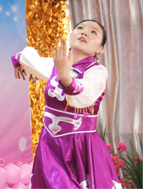 丹丹告訴筆者,之所以會(huì)選擇“鴻雁”這支舞蹈,是因?yàn)橄矚g上了“鴻雁”那首歌,歌聲悠揚(yáng)婉轉(zhuǎn),仿佛把她帶到了大草原,看到了美麗的牧羊姑娘,看到了悠閑的馬兒,看到了像白蓮花般盛開(kāi)的氈包……因?yàn)檎也坏胶线m的舞伴,丹丹只好把這支集體舞改成了獨(dú)舞,練習(xí)中她不是純粹的模仿,也會(huì)適當(dāng)?shù)馗木帯>毩?xí)鴻雁時(shí)自己傷佛也變成了一只北歸的大雁,那是一種很奇妙的感覺(jué)。能夠在此次演出中獲得大家的認(rèn)可更是堅(jiān)定了她練習(xí)舞蹈的決心,丹丹表示會(huì)繼續(xù)練習(xí)舞蹈,爭(zhēng)取在下一次的演出中帶給大家更美的視覺(jué)盛宴。