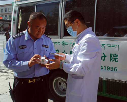 西藏阜康(國際)健康體檢中心根據(jù)民警們的職業(yè)特點,量身定制了體檢套餐。張德才院長介紹說:“為不耽誤民警的工作時間,醫(yī)院決定將體檢車直接開到民警的便民執(zhí)勤點,由專業(yè)醫(yī)護人員為民警進行血壓測量、心電圖測量、B超等方面的檢查。