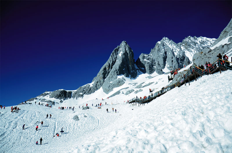 人文的掃興,索性來場(chǎng)自然之旅。第二天一大早我們就前往了玉龍雪山,還是被告知到達(dá)最高峰的索道票昨日售盡,我們的索道只到得了松杉坪?;貞浧饋恚@也許值得慶幸。松杉坪松樹高聳如云,木棧道旁有積雪未化,風(fēng)過樹梢的積雪隨風(fēng)灑落,偶爾有小松鼠一躍而過,牦牛悠閑自在的吃著草,遠(yuǎn)處是玉龍雪山的最高峰,仿佛近在咫尺。我想所有的生生死死都應(yīng)該在這里戛然而止,所有浮躁的靈魂都應(yīng)該在這里接受洗禮,進(jìn)入輪回,拋卻紅塵暫享這片刻的永生。她是我去過最接近天堂的地方,