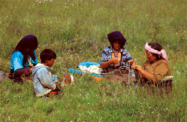 不知不覺,我的腳也和著他們的節(jié)拍跳了起來,我不敢走得太近,生怕打破了這歡樂的氣氛,卻又不肯隔得太遠(yuǎn),生怕失去這升騰在心中的溫暖。就這樣 ,以一個(gè)旁觀者的身份,我來到藍(lán)色暫住區(qū)的草地,空中已升起晚飯中的炊煙,飄蕩在夕陽未下的粉色天幕中,孩子們一哄而散,石鋪的大道中,只剩下整齊的廚房與形單影只的我,每家每戶,燈火通明,院子中各式各樣整齊的蔬果在精心耕耘的沃土中,披著一層暖橘燈與夕陽紅交織的面紗,還有幾戶的老人家在明亮的白熾燈下熟練地推拉著織毯機(jī),麻利地剪下一簇五顏六色的毛尾料,小心翼翼地壓下一尾尾漸漸變長的毛邊,擦擦汗,啜兩口甜茶,又繼續(xù),一直笑著。