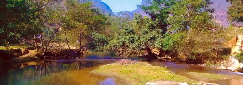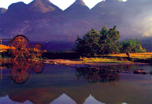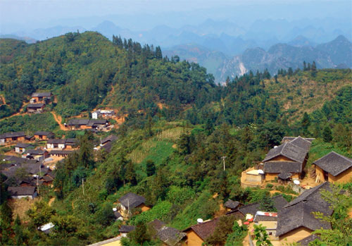 馱娘江消失在湯拿洞前,在猴爬巖洞后流經(jīng)一片崇山峻嶺環(huán)抱的平壩,又從桃源洞逝去,這個(gè)壩子就叫壩美村,一個(gè)好親熱的壯家山寨,位于云南省廣南縣八達(dá)鄉(xiāng)和阿科鄉(xiāng)之間,與廣西西林縣相鄰,一個(gè)現(xiàn)實(shí)中的世外桃源。
