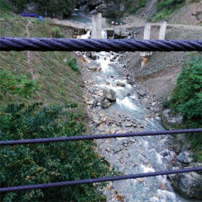 午飯之后是自由活動時間,我們兩車人決定去對面的大山中逛逛。一路穿過農(nóng)莊果園,竹林菜地。大路的盡頭在半山腰間的亭邊,我們只能下車徒步去欣賞更深層的美景。山間驟雨,并沒有澆滅我們的熱情。漫步在木棧竹徑,青翠片片,竹林清幽,溪水潺潺, 晶瑩剔透。清風拂過竹林驚起溪水蕩漾,空氣中都能嗅到濕潤的泥土與清新的花香彌漫交融。憩息在亭臺軒榭,薄霧冥冥,暗香流動,煙雨蒙蒙,如詩如畫。細雨落在山間織起飄渺幕幔,山谷里都能聽到飄來的煙嵐與青翠的竹林清奏天籟。站著煙雨中的吊橋上,詩意而空靈。在這蒙蒙細雨之中我體味到純凈清幽的大自然。