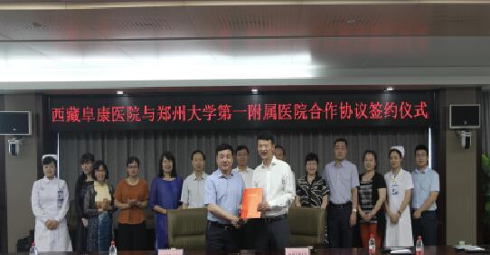 2017年6月2日上午9:00在河南鄭州大學(xué)第一附屬醫(yī)院鄭東院區(qū)8號樓會議室舉行了一場隆重的簽約儀式。西藏阜康醫(yī)院與鄭州大學(xué)第一附屬醫(yī)院在這里正式簽署了兩院合作協(xié)議。今后鄭州大學(xué)第一附屬醫(yī)院將在在遠程醫(yī)療會診、??平ㄔO(shè)、人才培訓(xùn)、雙向轉(zhuǎn)診、科研合作方面,給予阜康醫(yī)院全力支持。