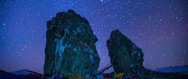 待得夕陽落盡,繁星滿天,九垓汗漫,玉宇無塵,皓月灑下一天一地的清輝,照得湖面靜沉沉如一塊青碧琉璃。天上桂魄流光,地下瑩玉幻彩,上下爭輝之際,人處其中,如置身于晶宮鮫室,亦幻亦真,似臨仙境。納木錯是藏密圣地,緣湖一帶似也受到佛法洗禮,便如禪那洞天,菩提妙境。佛學無法無相,漫無涯涘,水之為物,也是隨圓就方,緣物賦形,納木錯正契合佛法妙諦。